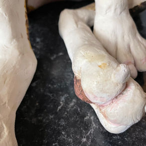 It took me a bit longer to model Vince in clay, he has a very soft, gentle character, definitely not an alpha male. He loves to lie around resting and sunbathing in the front room but is intimately aware of his surroundings, so I chose a reclining pose for him with an engaging alert expression. The modelling this time is a bit more refined and anatomically accurate, especially his feet. The Vince sculpture is cast again in Jesmonite but hollow this time. Once again the cast was white due to Vince being mostly a white dog, but strangely, the tiny areas of colour took a lot of care and attention to get right. Vince is also comfortable with his sculptural likeness.